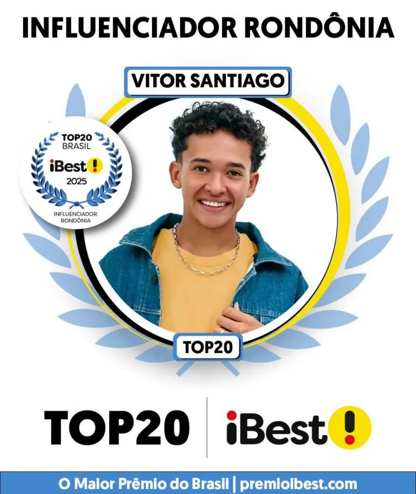 O influenciador mirim Vitor Santiago, acaba de ser classificado para o Top 20 do Prêmio iBest 2025 na categoria Influenciador Rondônia.