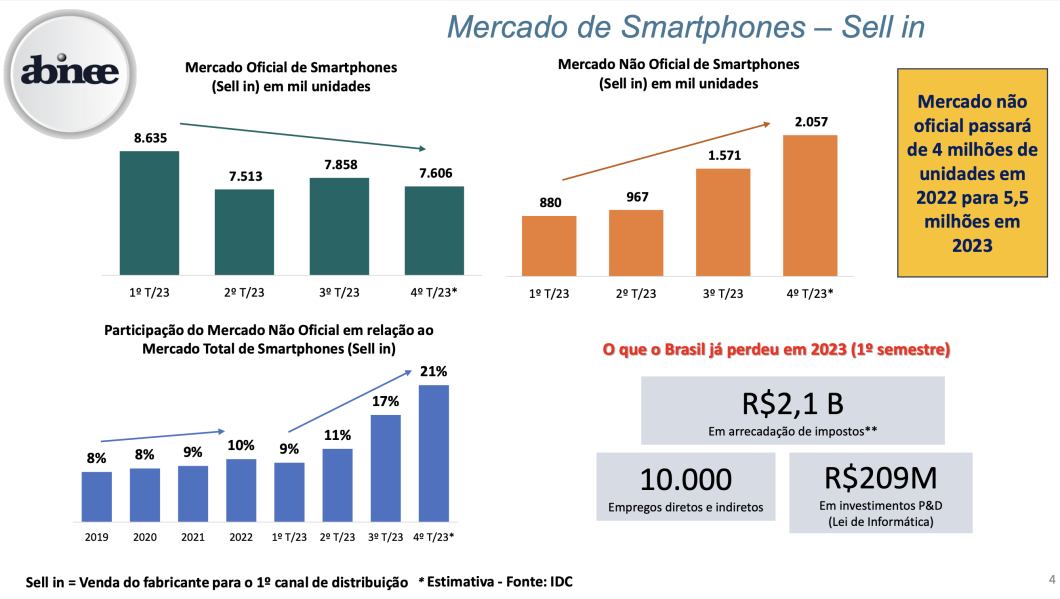 Os números divulgados pela Abinee e pela IDC mostram um salto nas vendas de aparelhos irregulares. Foram 880 mil no primeiro trimestre, 967 mil no segundo, 1,57 milhão no terceiro e 2,05 milhões neste quarto.