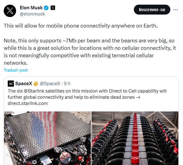 No X/Twitter, Elon Musk, dono da SpaceX, destacou que o Direct to Cell ampliará a cobertura da rede LTE. O bilionário também reconheceu que o serviço não tem competitividade contra as redes terrestres. Este tipo de tecnologia permite que a conexão 4G atinja velocidades maiores do que as transmissões por satélite.