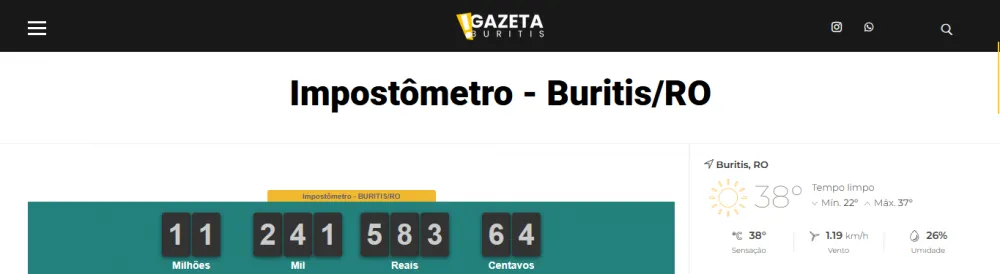 O Impostômetro de Buritis (RO), disponível no site da Gazeta Buritis e da Associação Comercial e Industrial de Buritis (ACIB), registrou a marca de R$ 11.241.400,00 em arrecadação de impostos no ano de 2025.