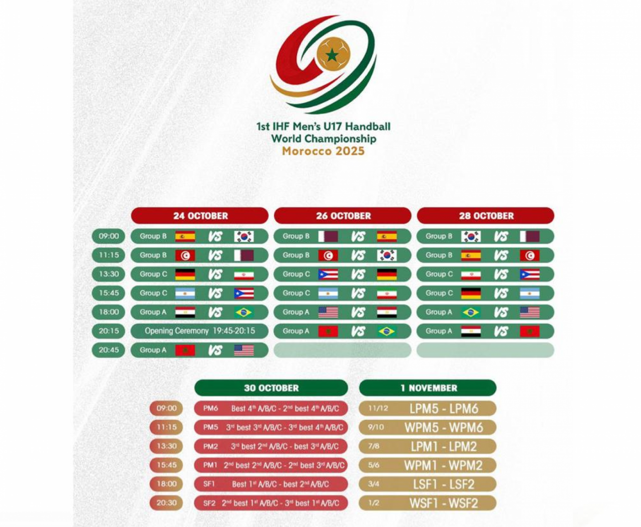 O grupo brasileiro enfrentará uma das chaves mais equilibradas da competição. No Grupo A, além do Brasil, estão Marrocos, Egito — atual vice-campeão mundial sub-19 — e Estados Unidos. A estreia da equipe será no dia 24 de outubro, sexta-feira, contra o Egito, às 18h (horário do Marrocos / 23h horário do Mato Grosso).