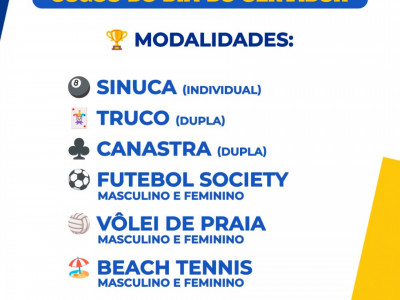 No sábado (25 de outubro), as atividades começam cedinho. Das 8h ao meio-dia, no Centro de Convivência da Pessoa Idosa (CCPI), serão promovidos os campeonatos de truco, canastra e sinuca. À tarde, a partir das 16h, na Praça da Juventude, será dada continuidade aos torneios de futebol Society, vôlei de praia e beach tênis, todos nas categorias masculina e feminina. A festa continuará com a premiação das duplas vencedoras do truco, canastra e sinuca, música e praça de alimentação.