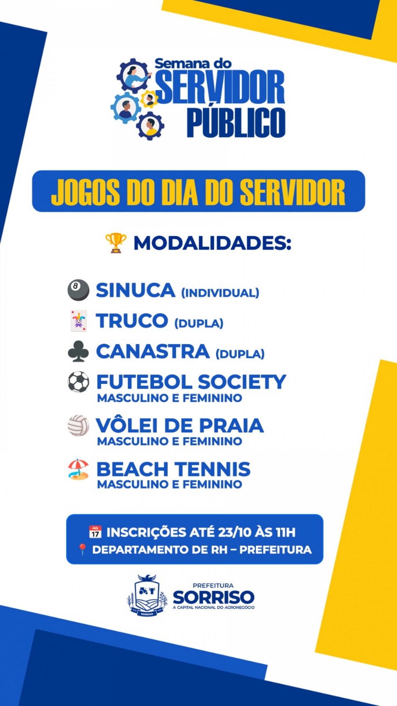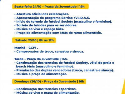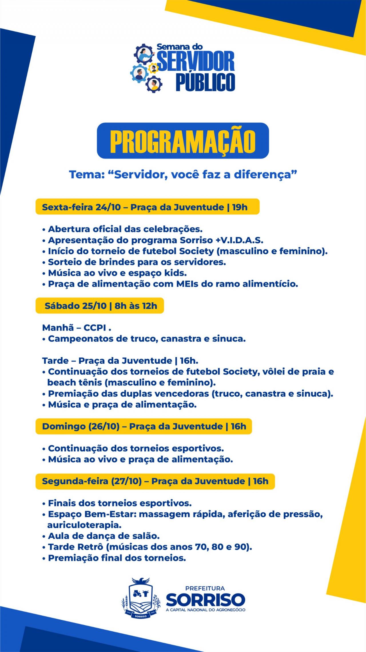 A Administração Municipal também está promovendo mais uma edição dos Jogos do Servidor, que vai resultar em muita confraternização, esporte, diversão e integração. Com o tema “Servidor, você faz a diferença”, a rodada de atividades começa hoje (24 de outubro), na Praça da Juventude, às 19h. Na solenidade, será oficialmente apresentado aos servidores o programa Sorriso +V.I.D.A.S, e iniciado o torneio de futebol Society (nas categorias masculina e feminina). Os servidores presentes ainda participarão do sorteio de brindes e poderão desfrutar de música ao vivo e espaço kids para a criançada. Para que a festa seja completa, serão disponibilizados espaços para que microempreendedores individuais (MEIs) do ramo de alimentação comercializem suas delícias.