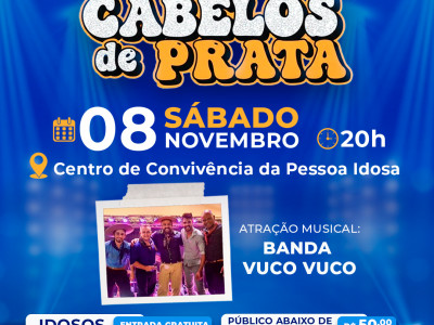 A Banda Vuco Vuco promete animar o Centro de Convivência da Pessoa Idosa (CCPI), em mais uma edição do tradicional Baile Cabelos de Prata. A entrada para o evento é gratuita para quem tiver mais de 60 anos, bastando somente apresentar o documento de identidade. Para os menores de 60, é cobrado o ingresso de R$ 50.