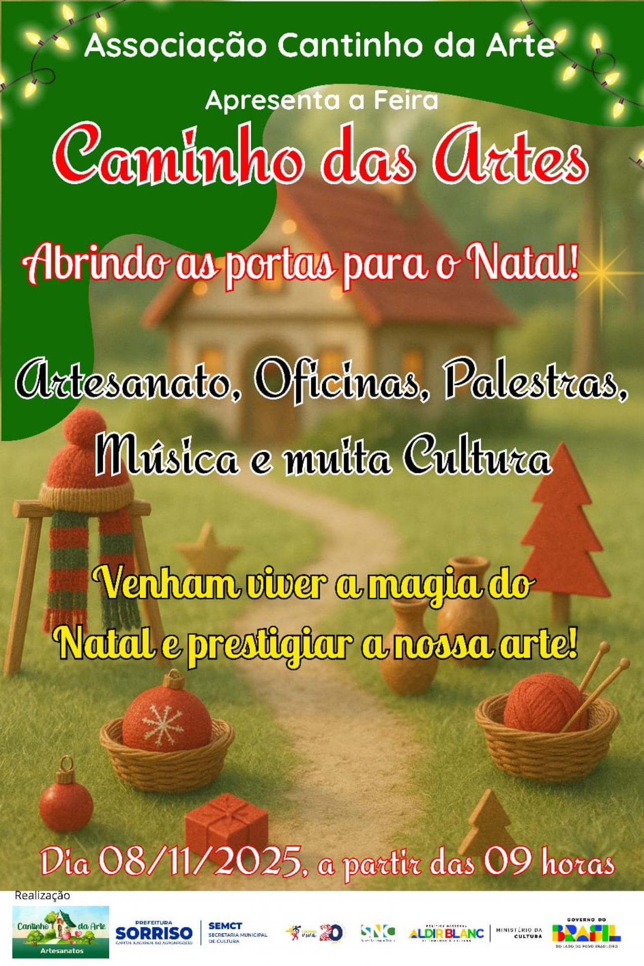A Feira Cultural Caminho das Artes é uma realização da Associação Cantinho da Arte, com apoio da Prefeitura de Sorriso, por meio da Secretaria Municipal de Cultura e do Governo Federal através da Lei Aldir Blanc de incentivo à cultura.