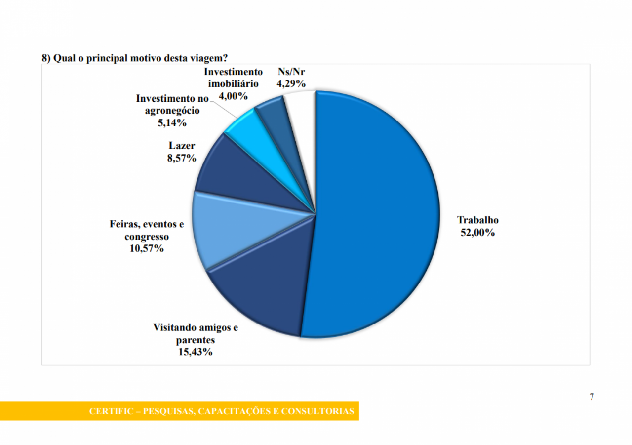 A pesquisa ainda revelou o perfil dos turistas que visitam Sorriso, suas preferências de consumo e o gasto médio diário durante a estadia. O levantamento mostra que a maioria dos visitantes vem do próprio estado de Mato Grosso e que 52% das viagens têm como principal motivação o trabalho, reforçando a força do turismo de negócios no município.