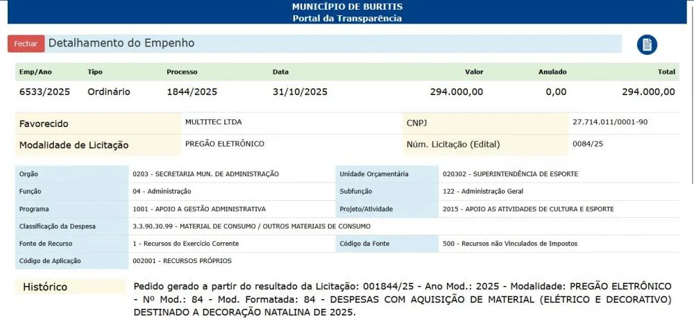O primeiro empenho, de número 6533/2025, tem o valor de R$ 294 mil e foi destinado à empresa Multitec LTDA (CNPJ 27.714.011/0001-90) de Cacoal (RO), vencedora do Pregão Eletrônico nº 84/2025. Esse contrato inclui a aquisição de mangueiras de LED, cortinas de luz, fitas neon, bolas natalinas, tecidos decorativos, árvores de Natal e esculturas de renas em fibra de vidro.