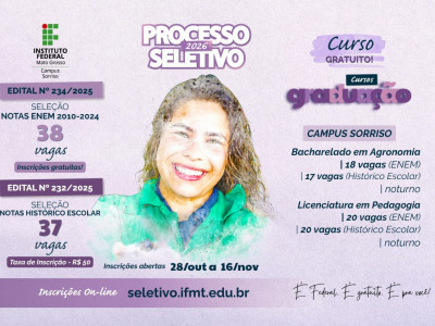 Somando as vagas dos dois processos, em Sorriso são ofertadas 40 vagas no curso de Pedagogia e 35 no curso de Agronomia. Ambos os cursos são presenciais, gratuitos, e ofertados no período noturno. Além dessas vagas, a seleção também contempla vagas para o curso de Engenharia Florestal ofertado na unidade do IFMT em Cáceres e Agronomia na unidade de Diamantino.
