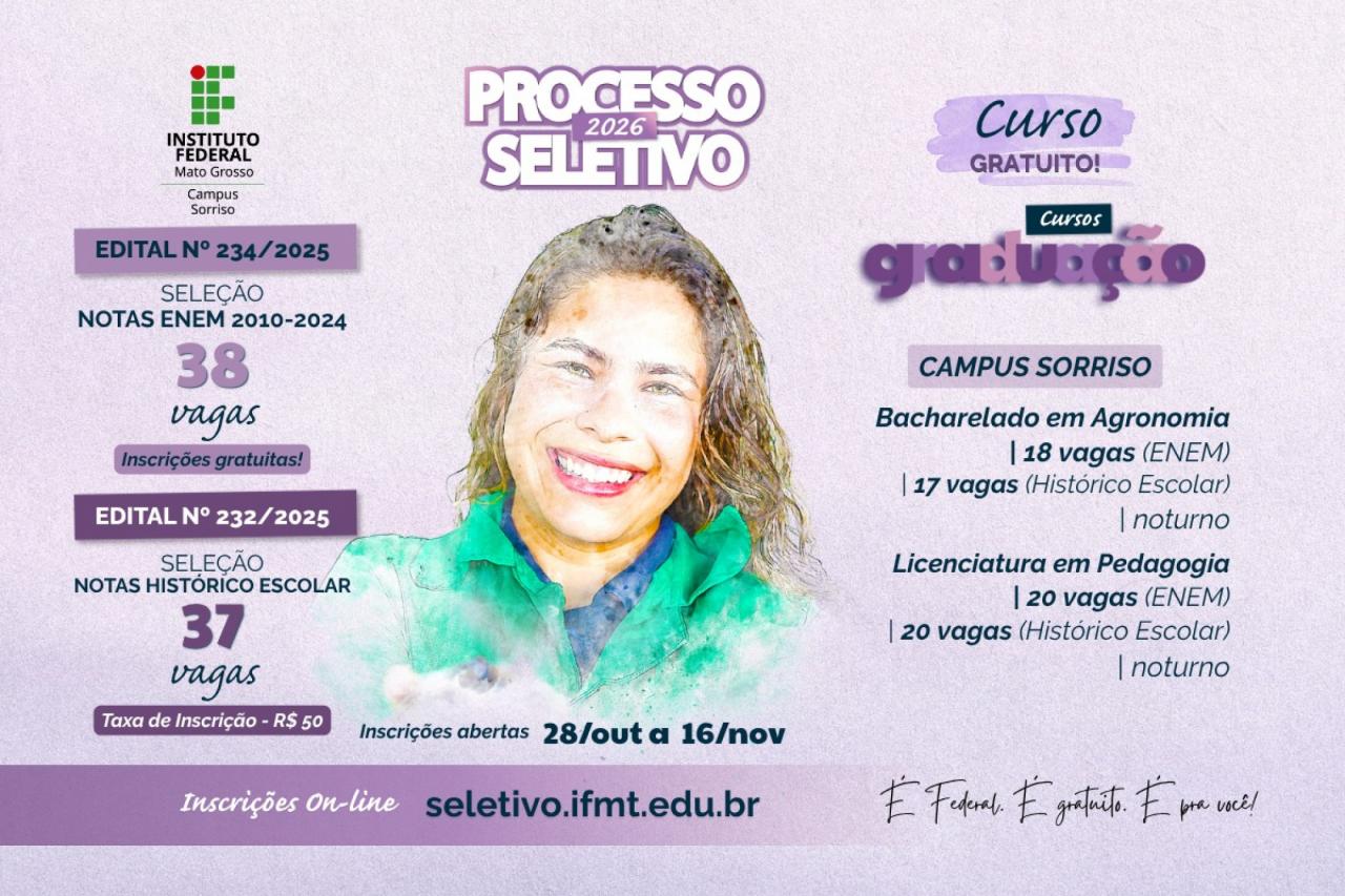 O Instituto Federal de Educação, Ciência e Tecnologia de Mato Grosso (IFMT) está com inscrições abertas para cursos superiores gratuitos em Sorriso, Cáceres e Diamantino até o próximo domingo (16/11), com um total de 155 vagas.