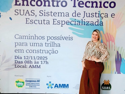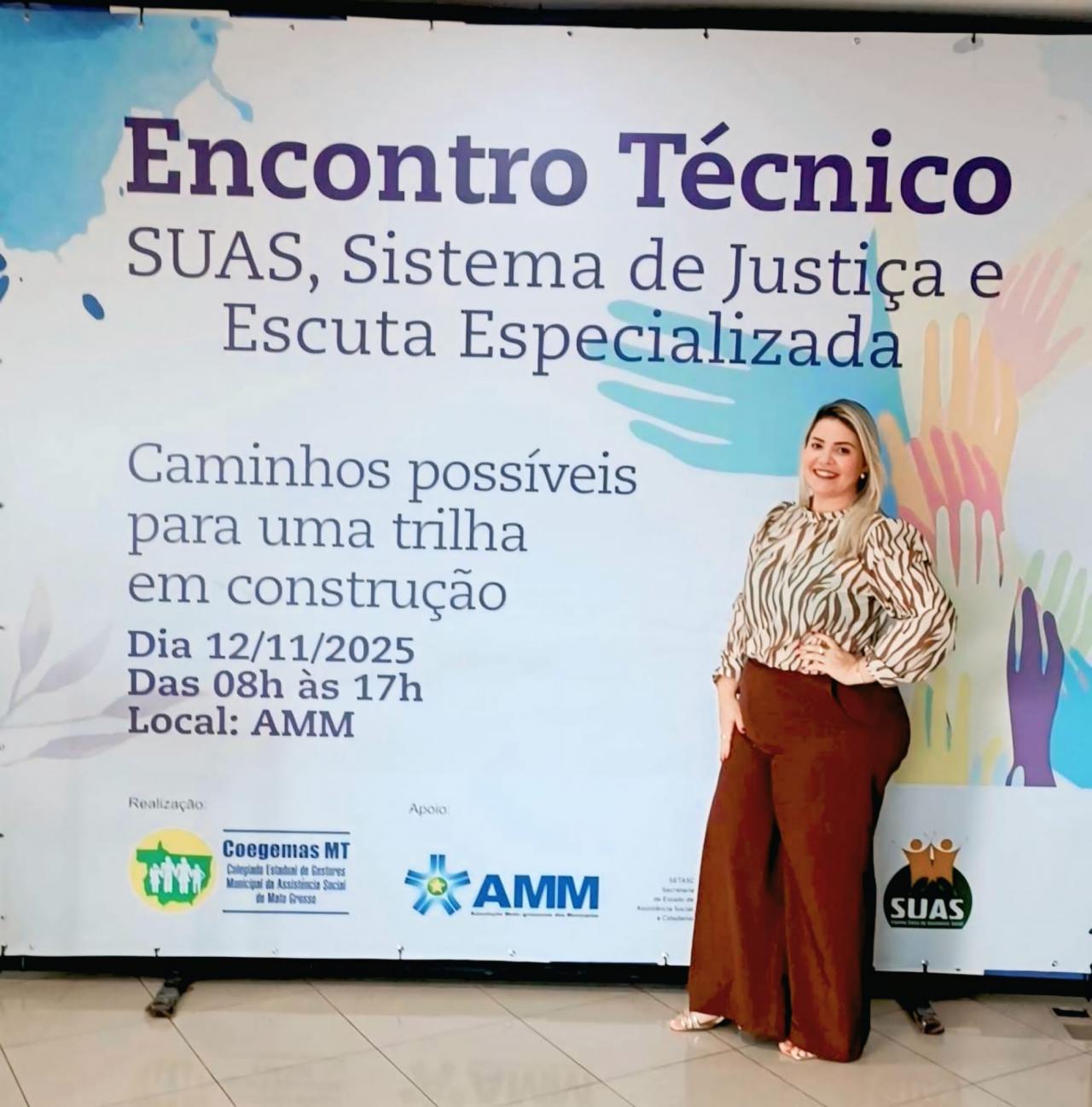 O evento “SUAS, Sistema de Justiça e Escuta Especializada: Caminhos possíveis para uma trilha em construção” reuniu gestores municipais e representantes de diversos municípios do estado de Mato Grosso em um importante espaço de diálogo e capacitação intersetorial. Entre eles, a coordenadora de proteção coordenadora de Proteção Social Especial da Secretaria Municipal de Assistência Social (Semas), Gheuren Frasseto.