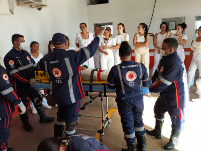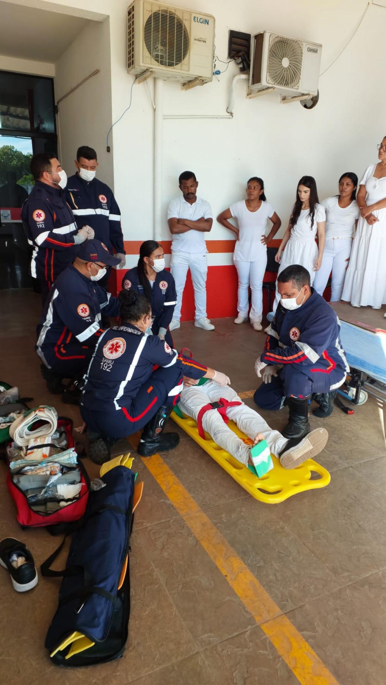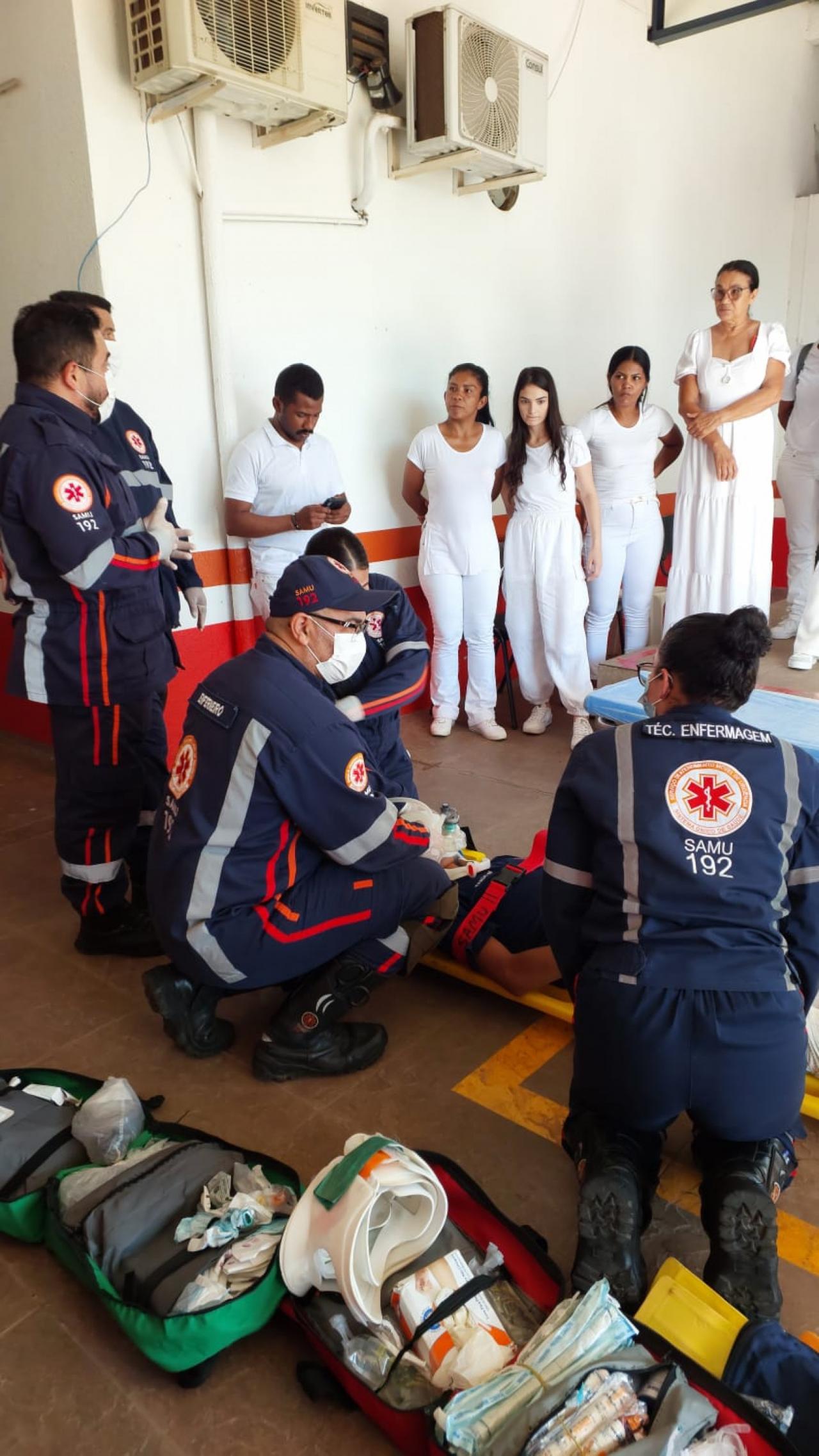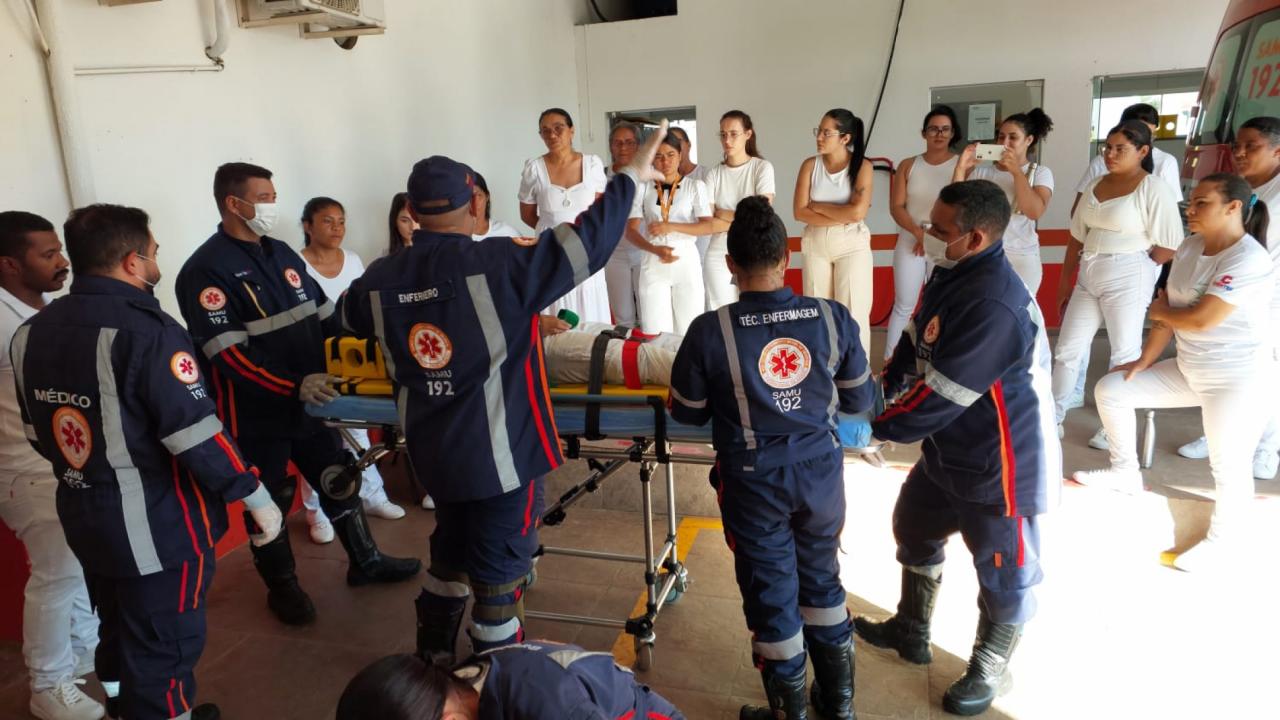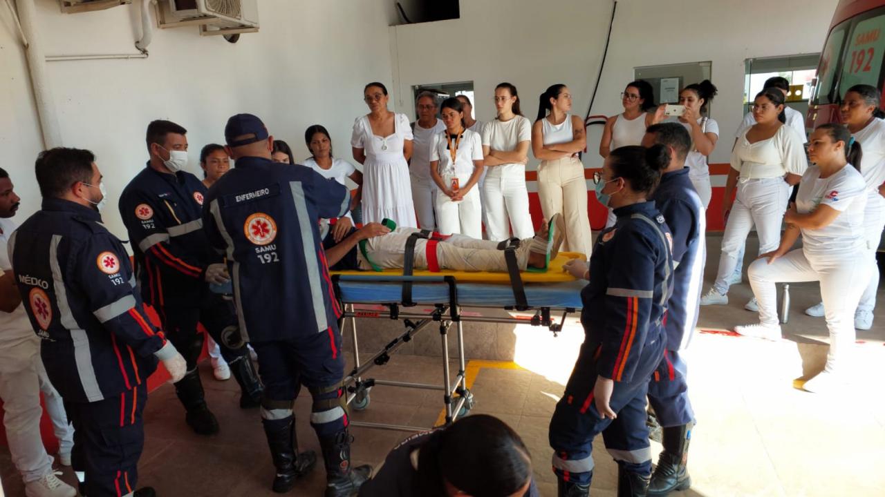 Para encerrar, os futuros técnicos em enfermagem participaram de uma roda de conversa com os profissionais, com momentos de esclarecimentos e tira-dúvidas, além de assistirem a uma simulação realista de atendimento a uma vítima de trauma.