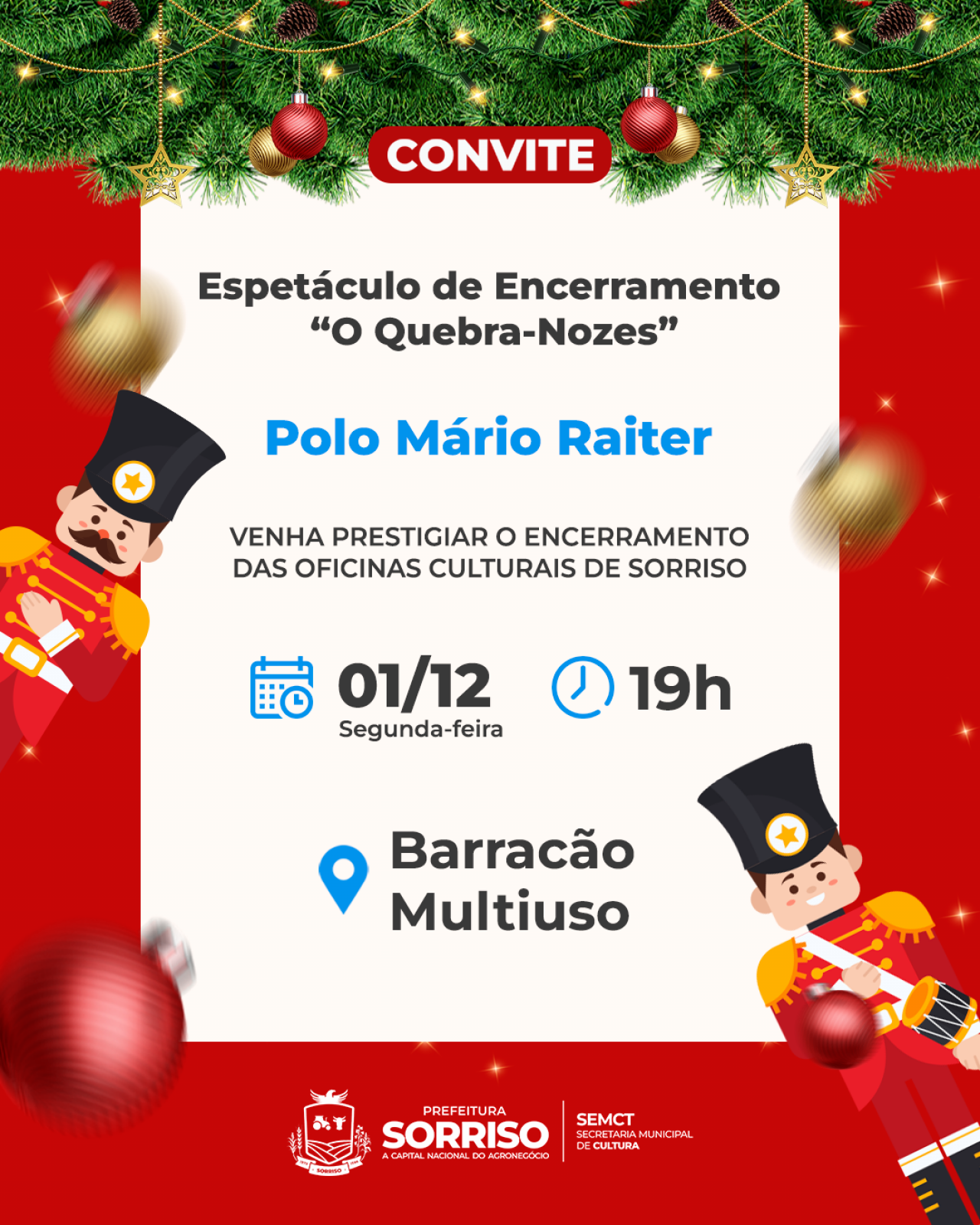 A partir de hoje, 1º de dezembro, todos os polos promovem suas celebrações de fim de ano, culminando com o espetáculo tradicional “O Quebra-Nozes”, que será apresentado em cada encerramento. O cronograma segue até 11 de dezembro, quando as atividades culturais serão suspensas, sem data definida para retorno em 2026.