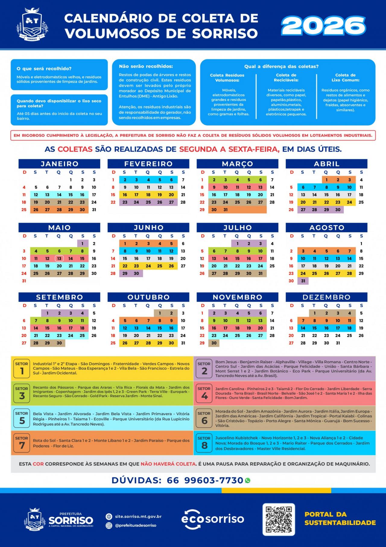 Depois, a coleta para para a pausa de fim de ano, e será reiniciada em 2026, no dia 12 de janeiro, no Setor 5, composto pelos bairros Bela Vista, Jardim Alvorada, Jardim Bela Vista, Jardim Primavera, Vitória Régia, Pinheiros I, Taiamã I, Ecoville e Parque Universitário (da Rua Lupicínio Rodrigues até a Avenida Tancredo Neves).