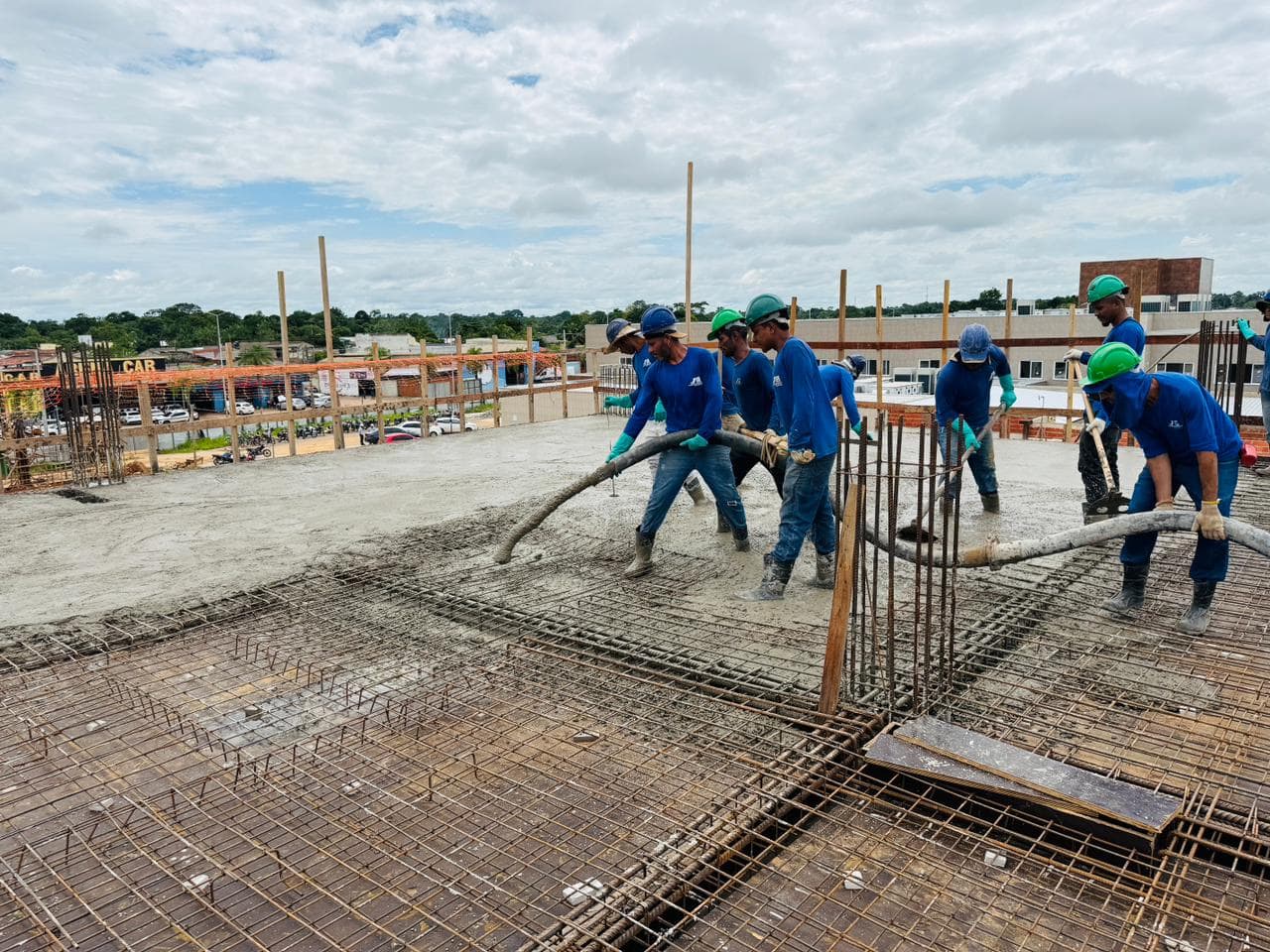 Paralelamente, a segunda etapa também apresenta avanços significativos, com a execução dos serviços de concretagem da primeira laje do prédio principal, atendendo ao compromisso do governo com o cumprimento do cronograma estabelecido.