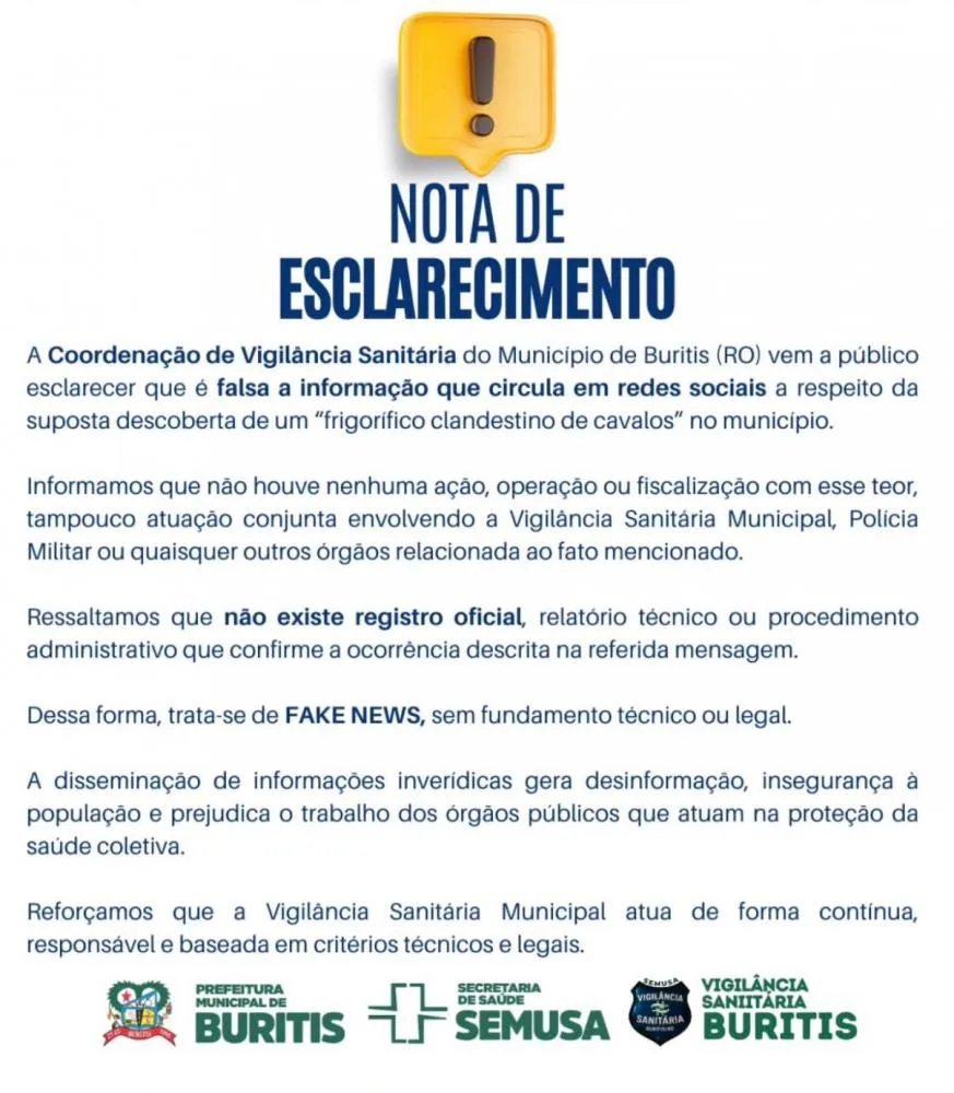 A redação da Gazeta Buritis recebeu diversas consultas de leitores via WhatsApp sobre a suposta descoberta de um frigorífico clandestino de cavalos em nosso município. O conteúdo falso, que circulava acompanhado de imagens fortes, afirmava que animais foram encontrados em situação de maus-tratos e que a carne seria destinada ao comércio local sem qualquer controle sanitário.
