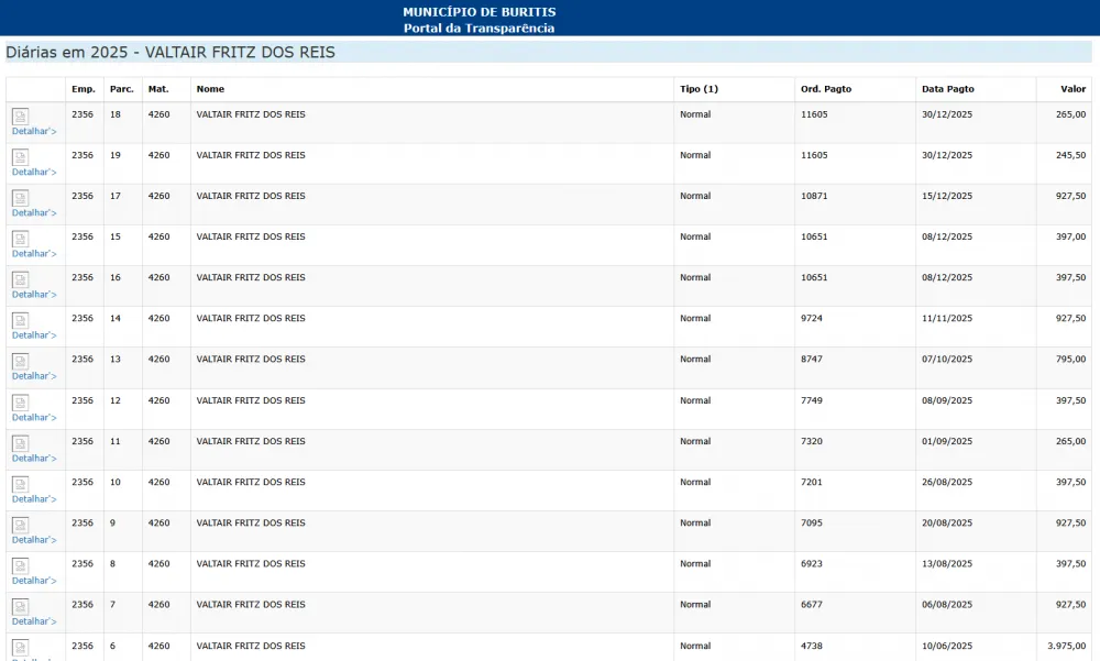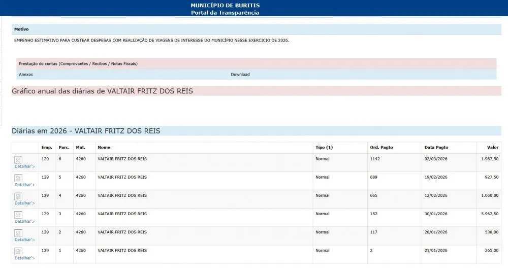 Levantamento realizado no Portal da Transparência aponta que o prefeito de Buritis, Valtair Fritz (PL), recebeu um total de R$ 10.732,50 em diárias entre janeiro e o início de março de 2026. Os valores referem-se a indenizações por deslocamentos oficiais para fora do município.