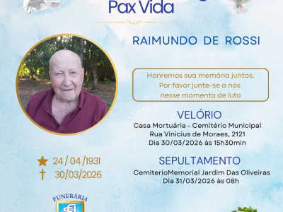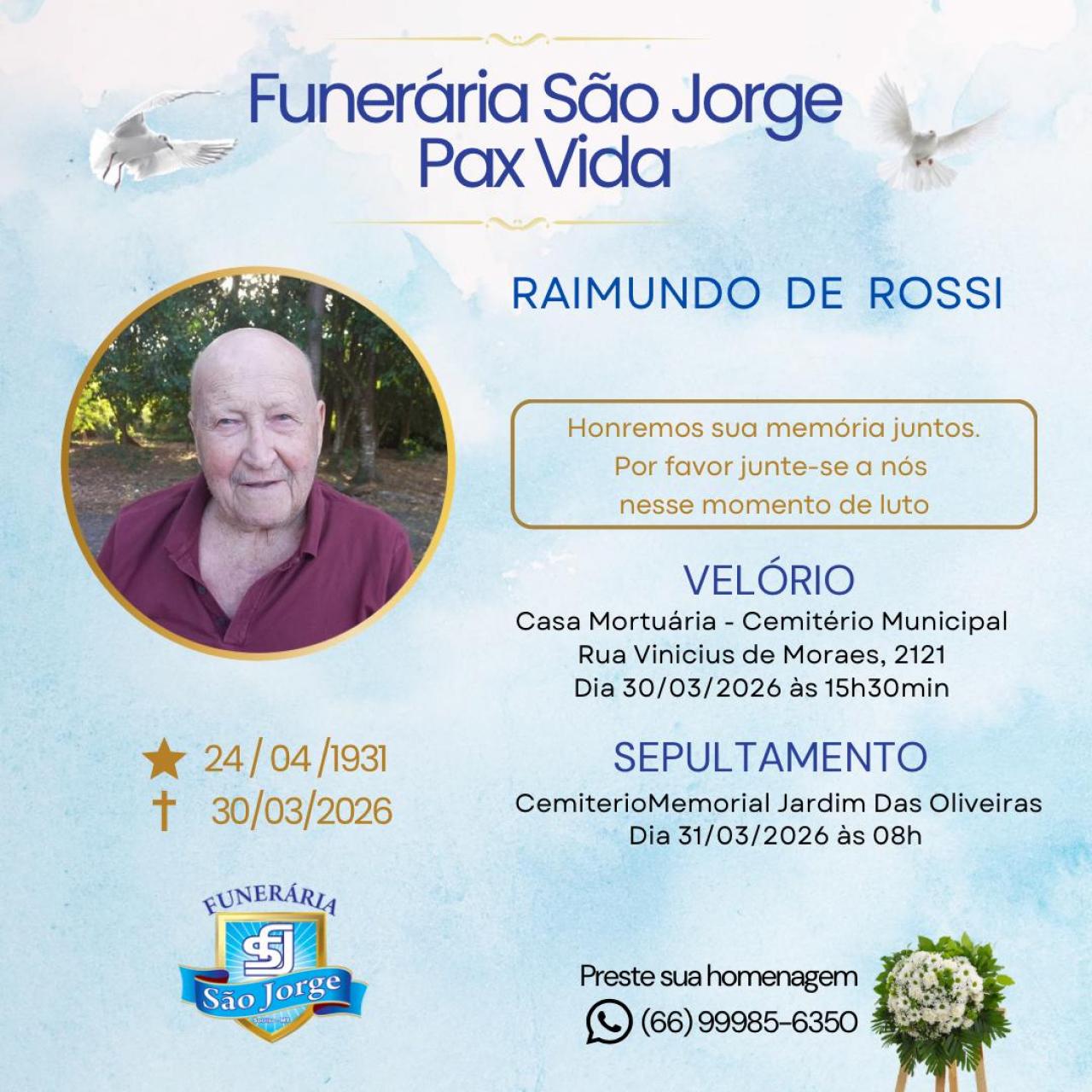 Desde 1985, junto ao filho Valdecir de Rossi, o “Taquara”, “Seu Raimundo” sempre foi figura presente na cidade que estava ainda nascendo. A Administração Municipal de Sorriso se solidariza, neste momento de despedida, aos sete filhos, 22 netos e 13 bisnetos de “Seu Raimundo”, estendendo a gratidão por sua relevante contribuição para Sorriso.