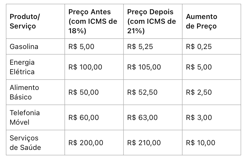 Vamos analisar como o aumento do ICMS afeta o bolso do cidadão com uma tabela comparativa de preços fictícios antes e depois dessa alteração.